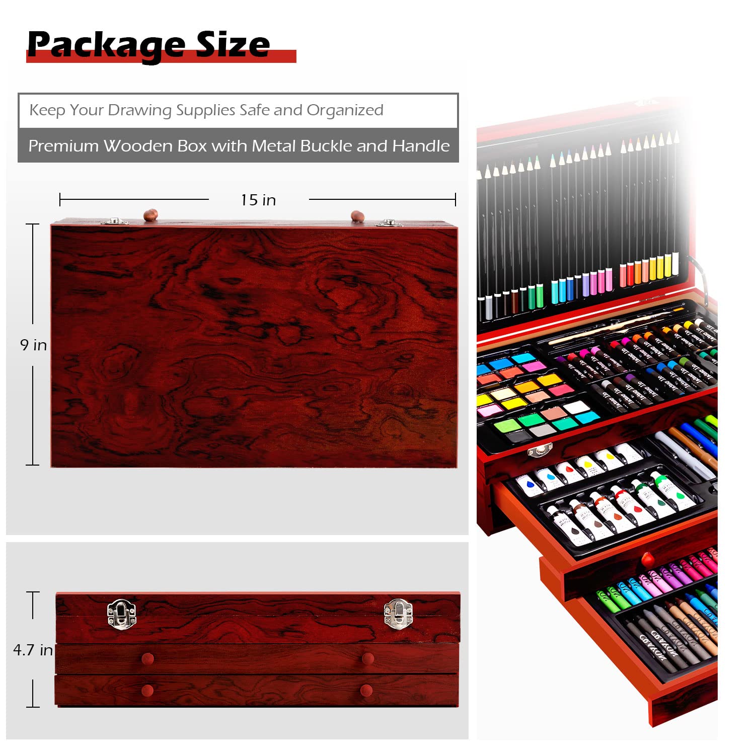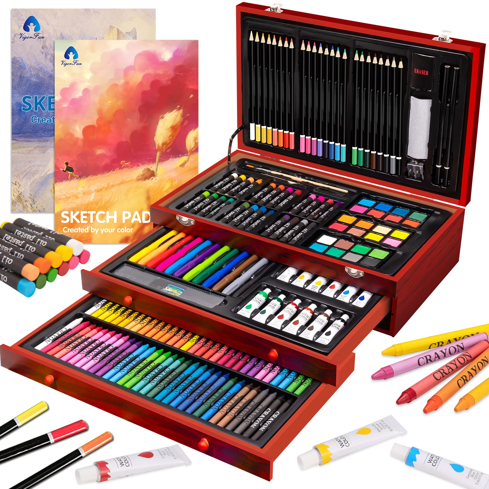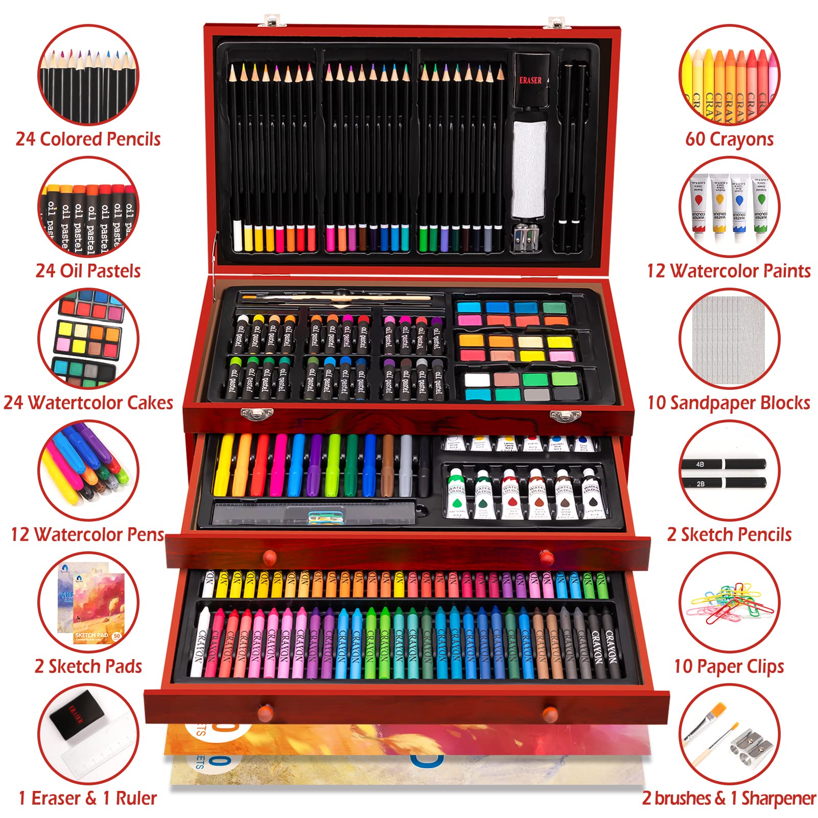 Art Supplies, 185-Piece Super Deluxe Wooden Art Set Crafts Drawing Kit with 2 Sketch Pads, Crayons, Oil Pastels, Colored Pencils, Watercolor Cakes, Creative Gift for Teens, Beginners Girls Boys