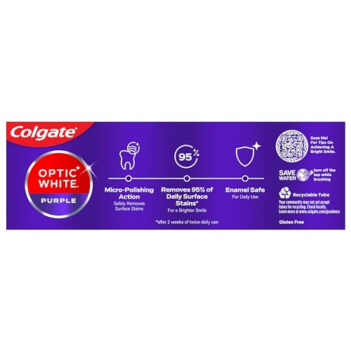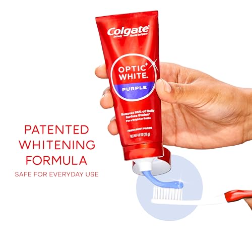 Colgate Optic White Purple Toothpaste for Teeth Whitening, Teeth Whitening Toothpaste with Fluoride, Helps Remove Surface Stains and Polishes Teeth, Enamel-Safe for Daily Use, Mint Paste, 4.2 oz