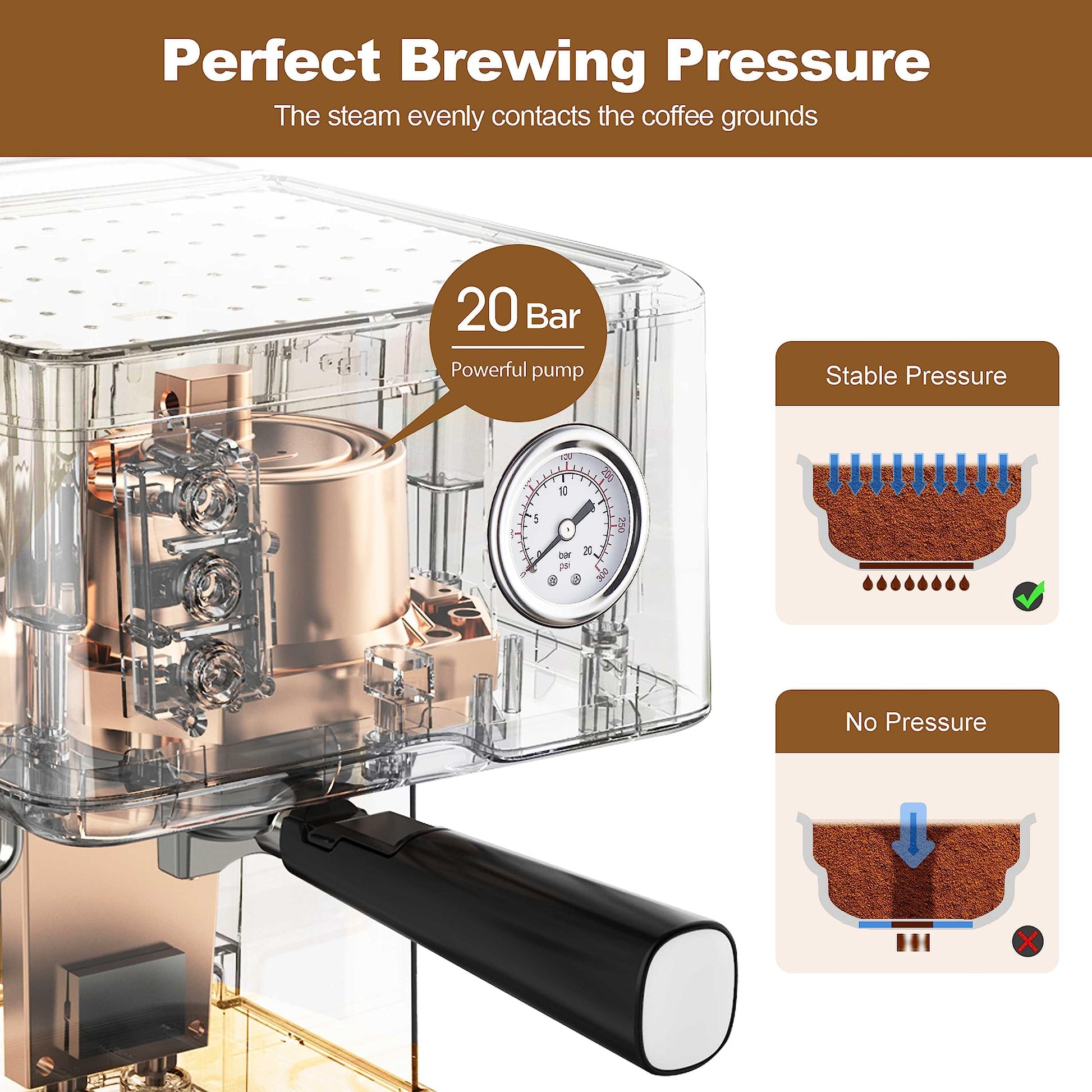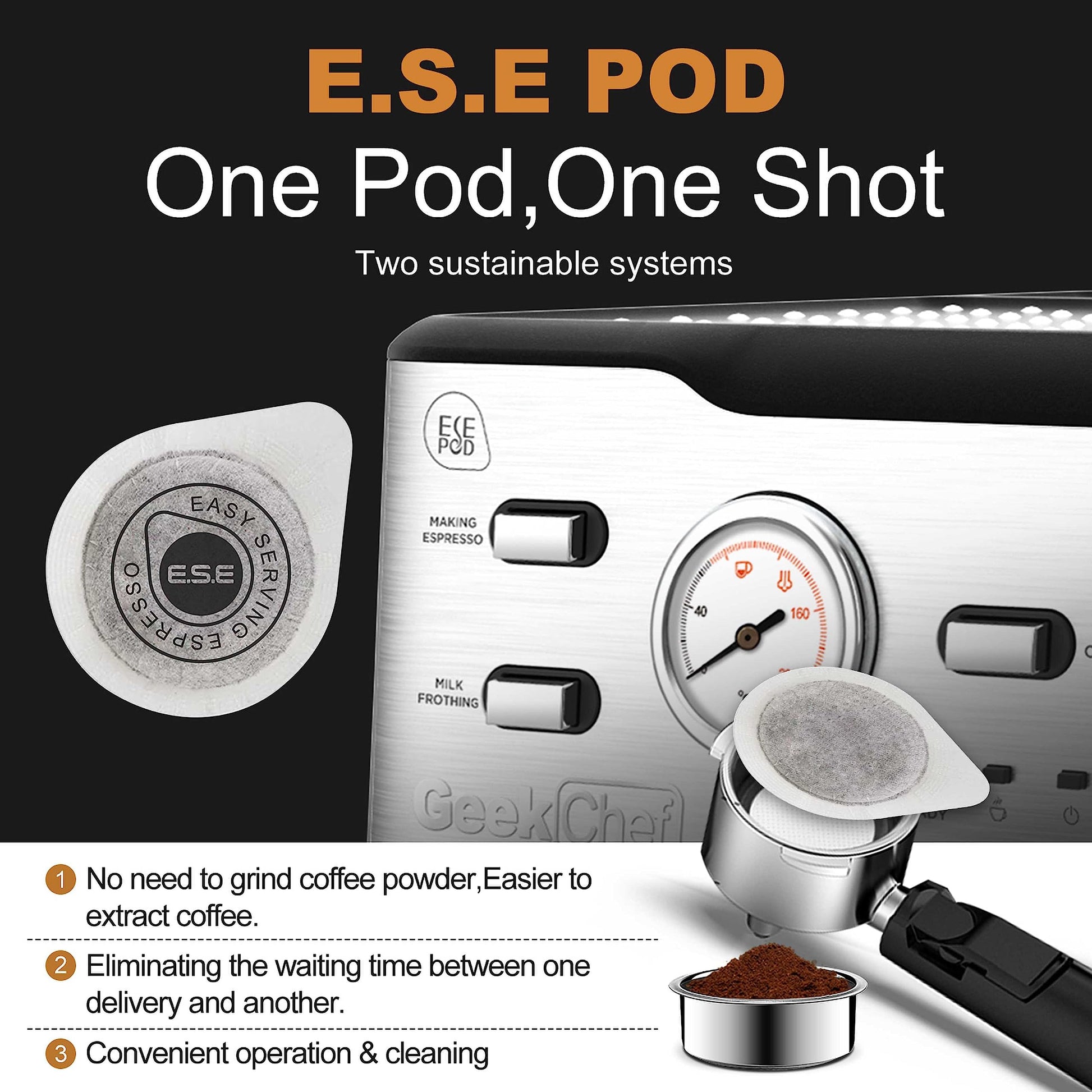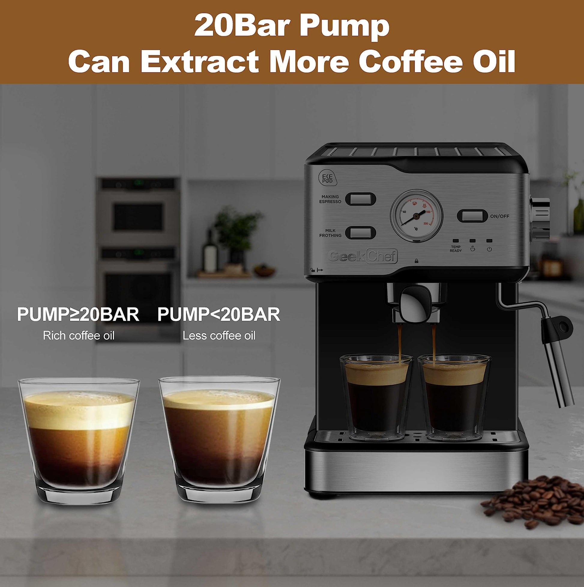 Geek Chef Espresso Machine 20 Bar, Cappuccino latte Maker Coffee Machine with ESE POD capsules filter&Milk Frother Steam Wand, 1.5L Water Tank, for Home Barista, Stainless steel 950W, Grey