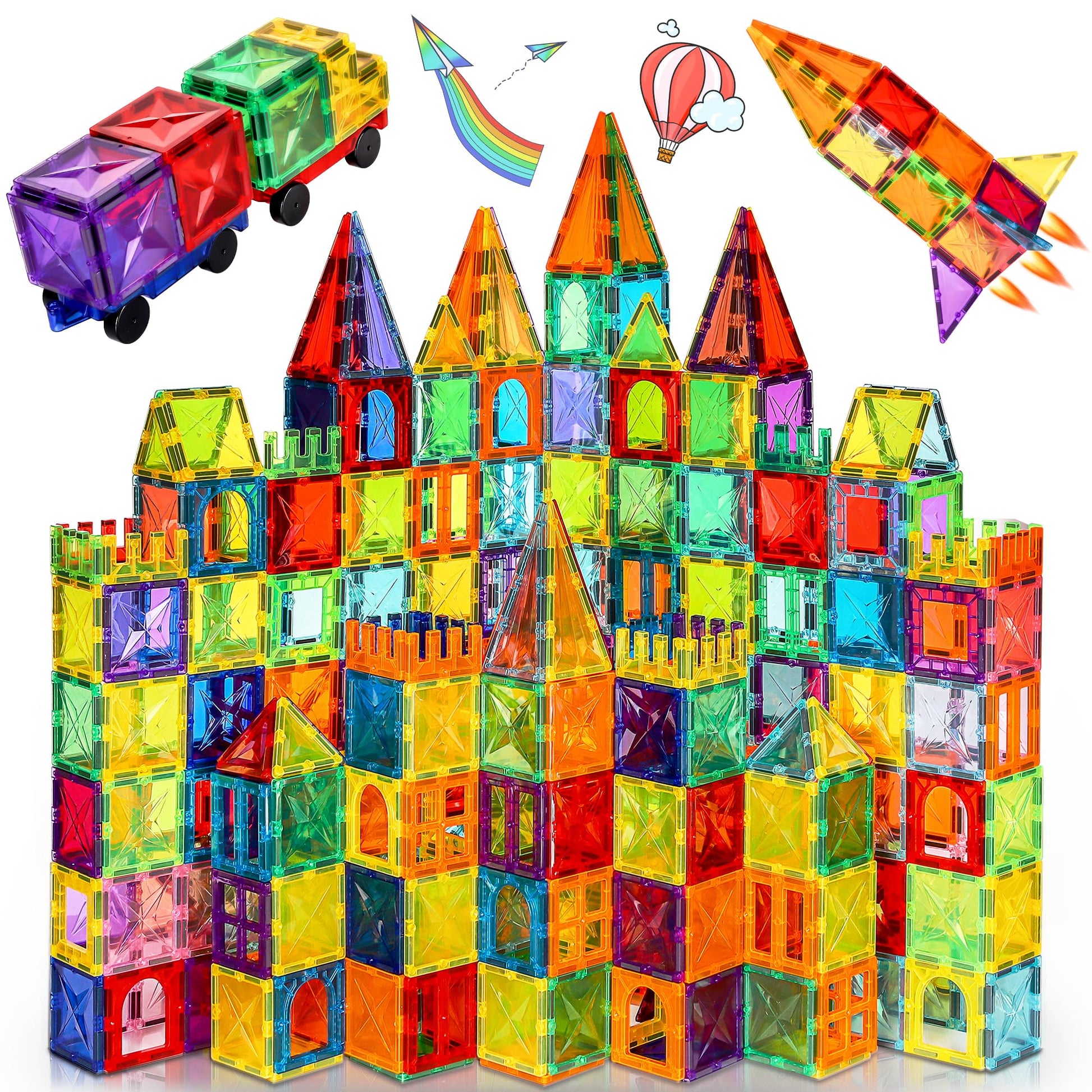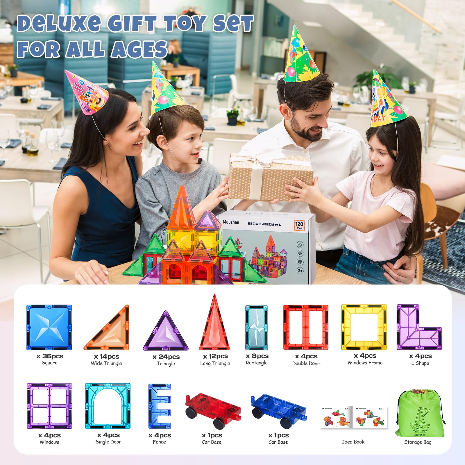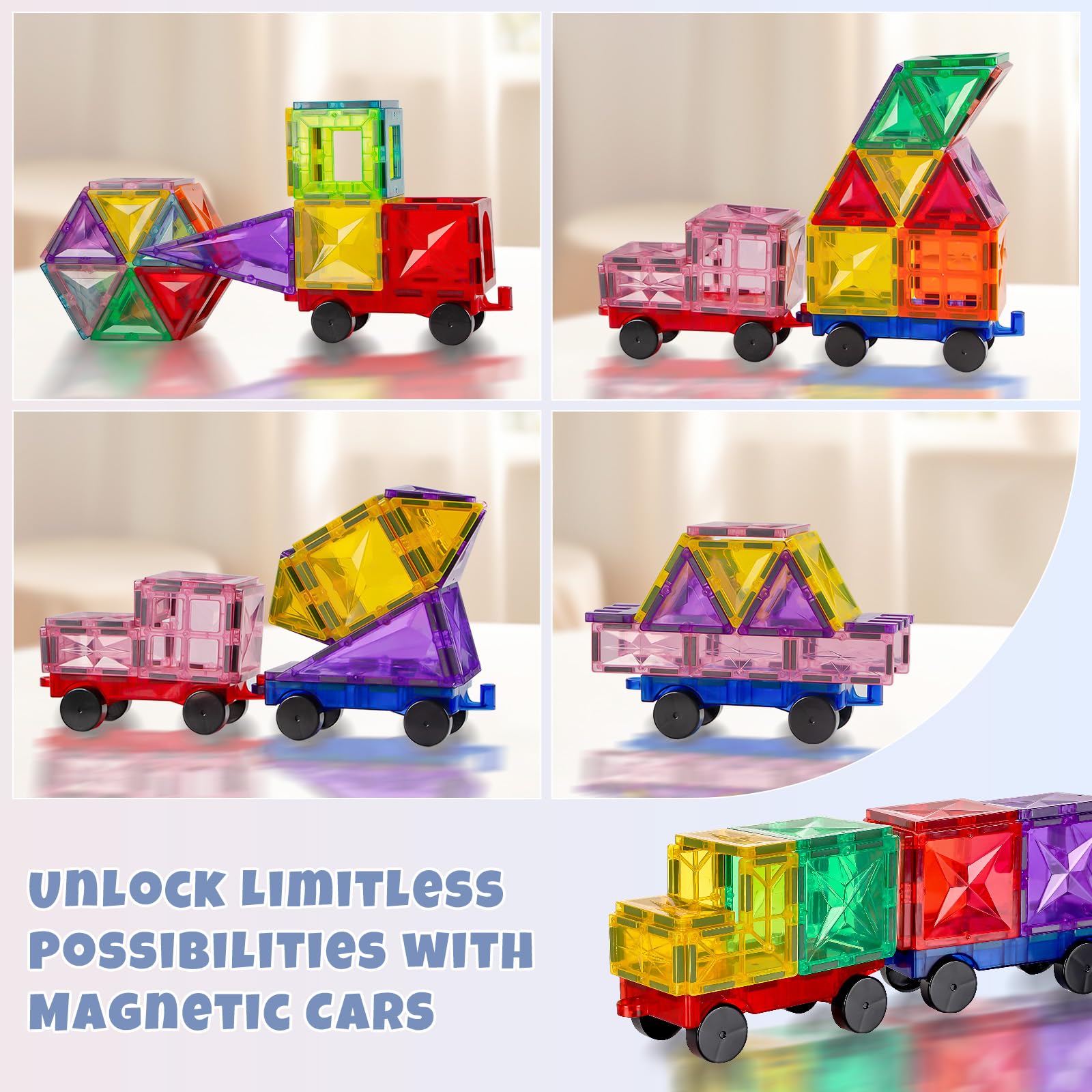 Meuzhen 120Pcs Magnetic Tiles with 2 Cars Toy Set, Diamond Magnet Tiles 3D Building Blocks, Toddler Montessori Toys for 3 4 5 6 Years, STEM Preschool Kids Sensory Educational Toys Gift for Boys Girls