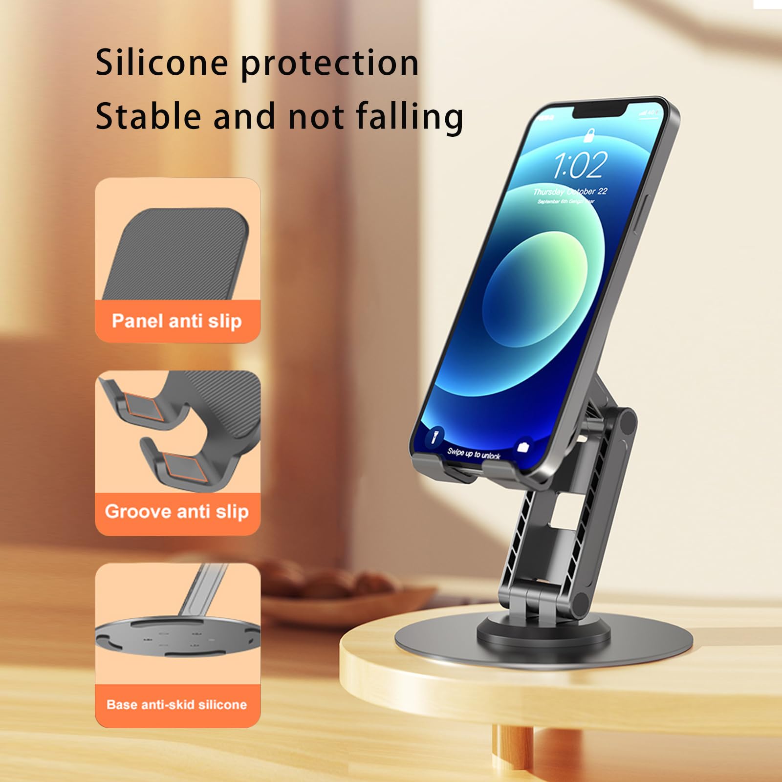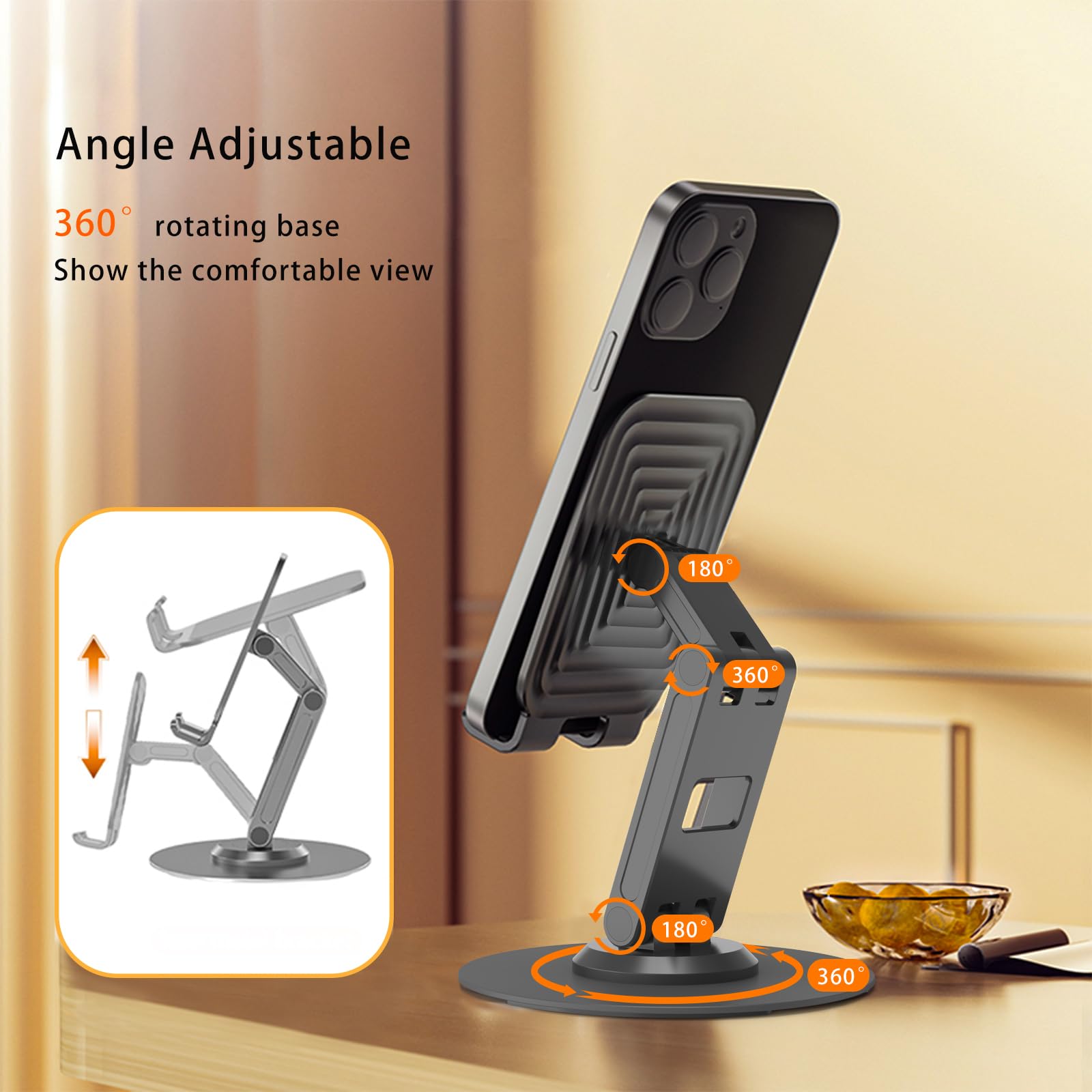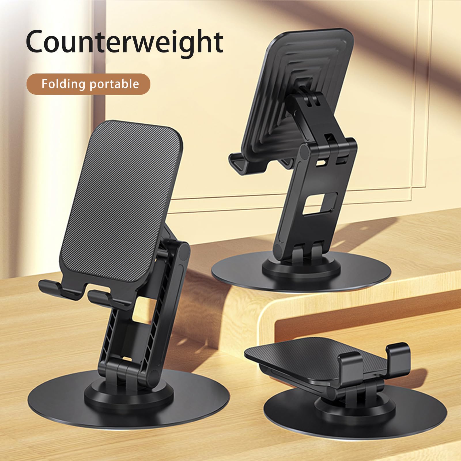 ONCHEER 360°Rotating Phone Holder for Desk, Portable & Foldable Cell Phone Stand for Office & Home, Angle & Height Adjustable Tablet Stand for All Smartphones, iPhone, iPad, Switch, Tablet - Black