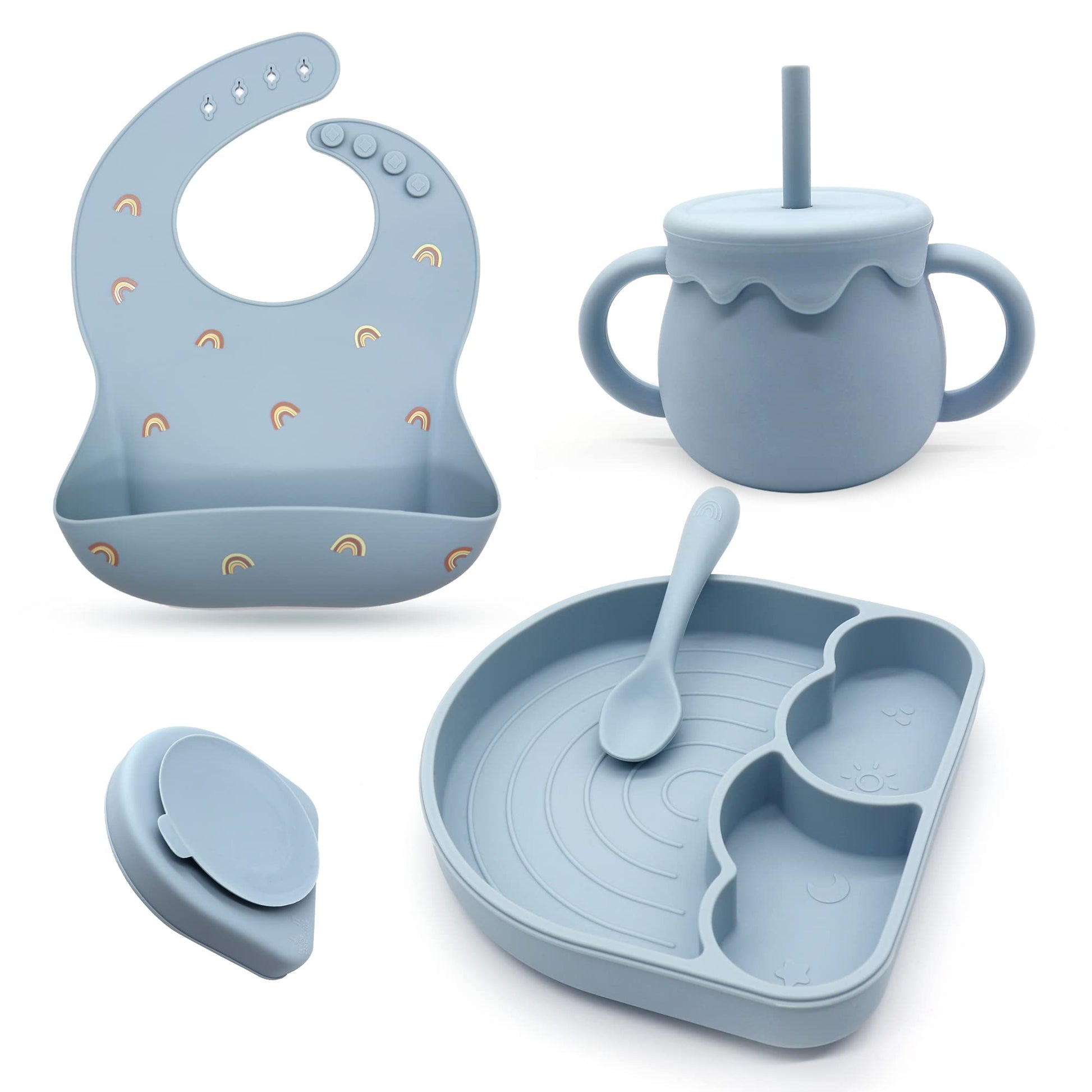 Santi & Me Baby Feeding Set Divided Plate with Suction, Adjustable Silicone Bib, Toddler Training Sippy Cup with Straw, Baby Led Weaning Spoon, Rainbow Plate Dishes and Utensils Set(Dusty blue)