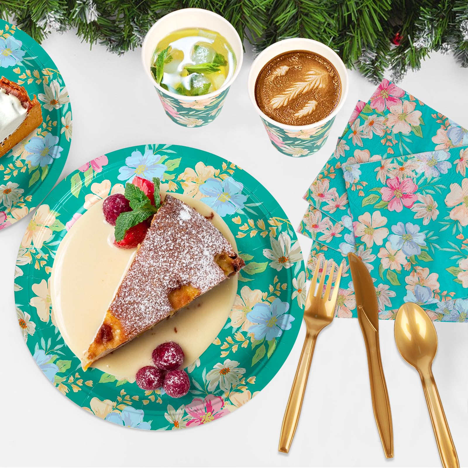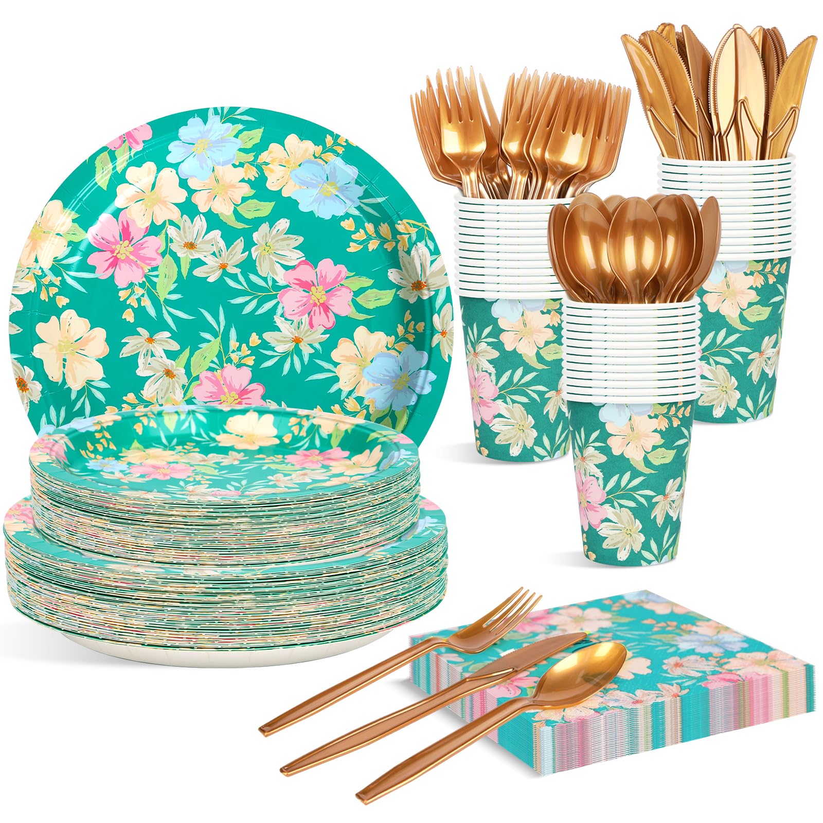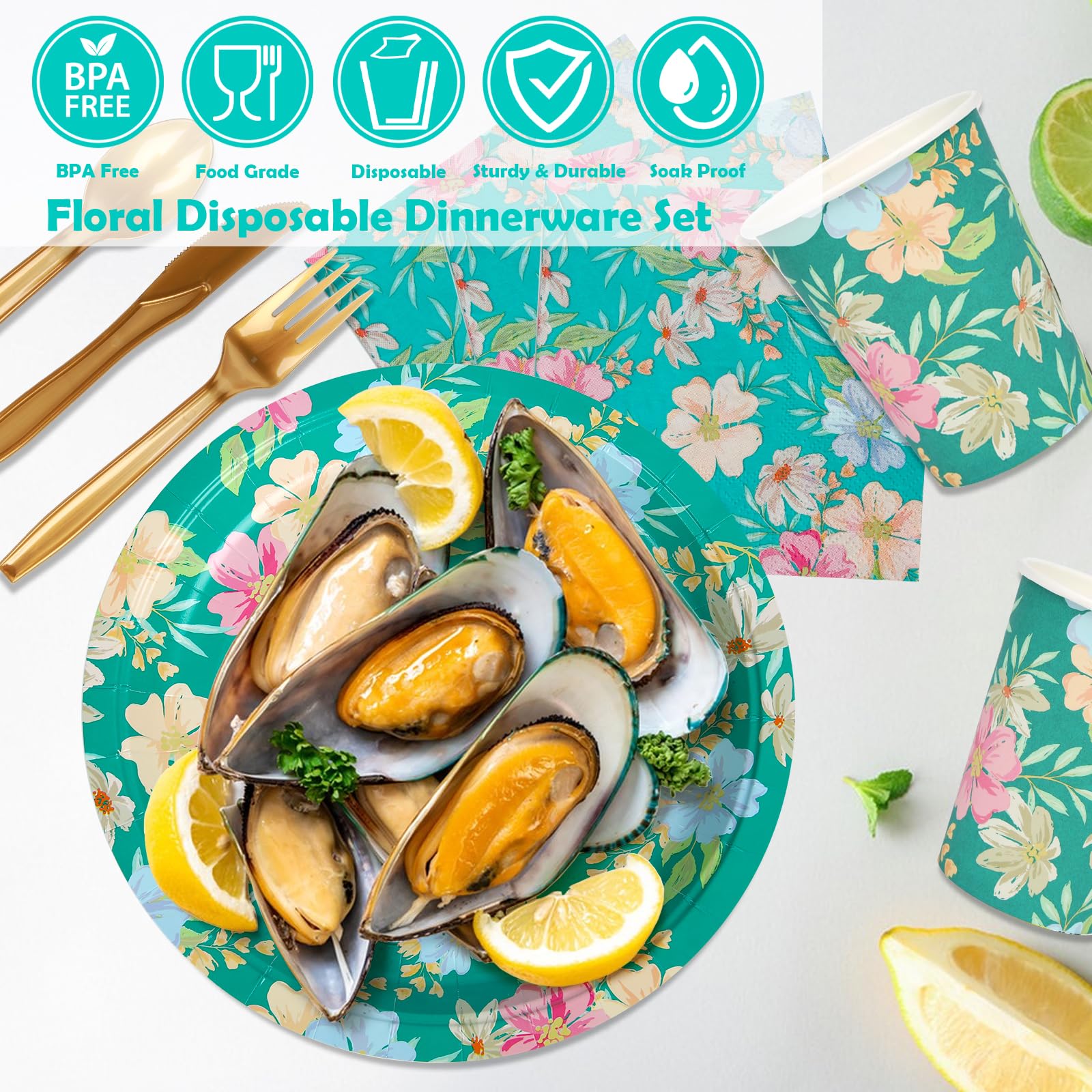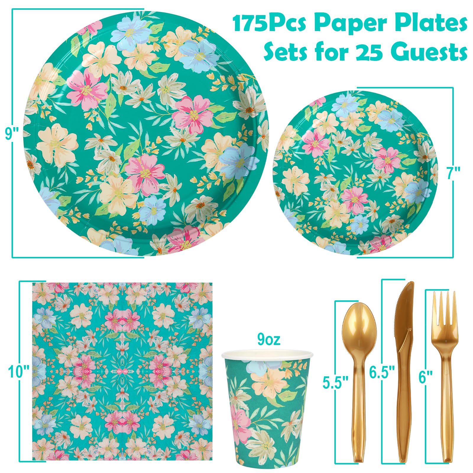 Uniecocus 175PCS Disposable Plates Set, Party Plates and Cups and Napkins Sets, Flower Paper Plates Set, Disposable Dinnerware Set for Party Wedding Birthday