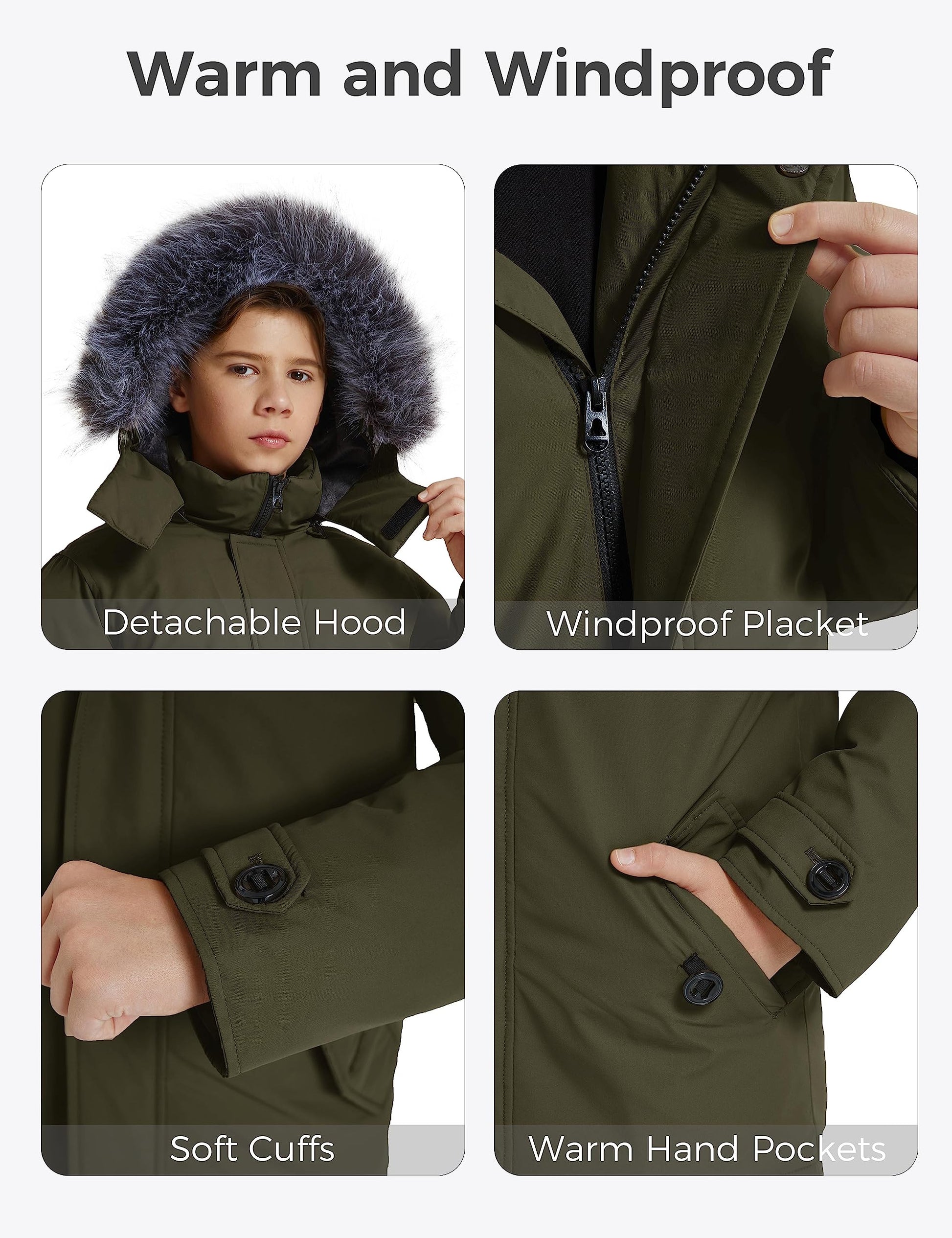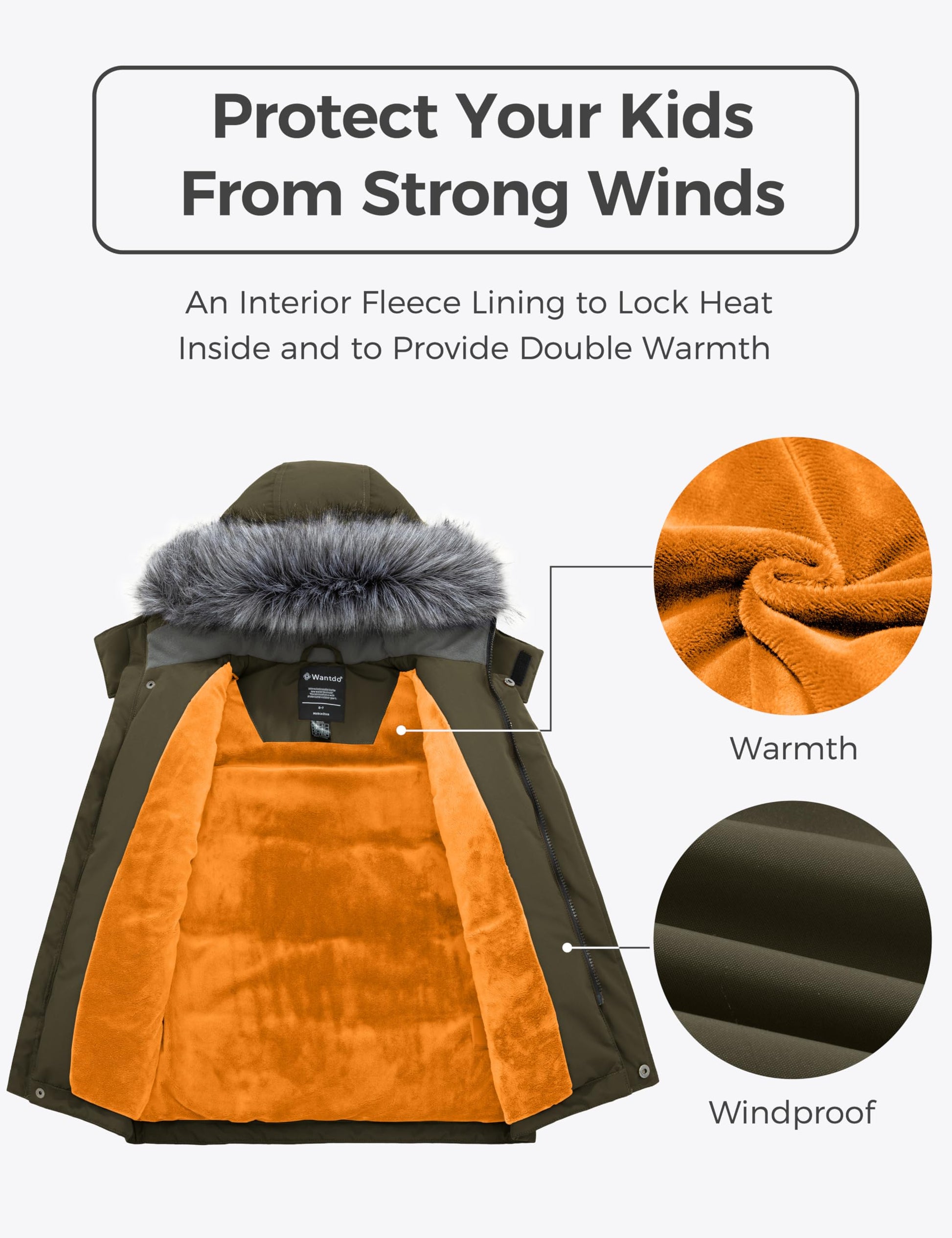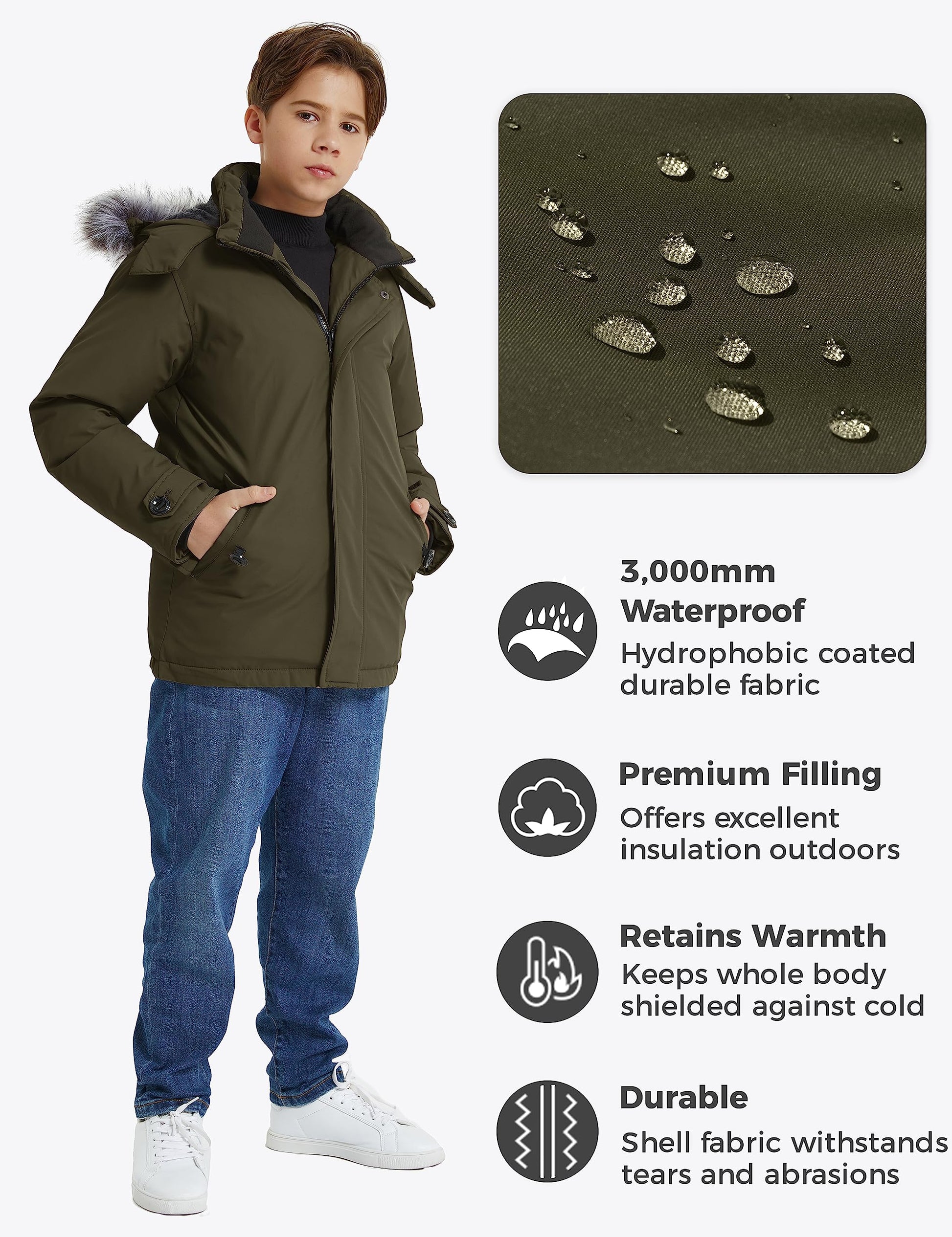 wantdo Boys' Hooded Puffer Jackets Water-Resistant Warm Fleece Winter Coat with Hood Army Green 6-7